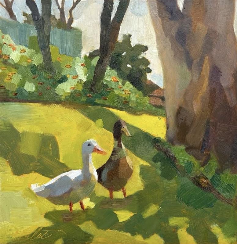 Harlow embraced the challenge of painting outdoors, finding inspiration in the lively atmosphere of paint-outs complete with tents, hubs and live music. One highlight was the Pinjarra Heritage Trail paint-out, where Harlow created 'Got Any Grapes?', an oil painting sparked by a playful encounter with geese that kept interrupting the scene. The piece captured the essence of the landscape while weaving in inventive details drawn from the surroundings.